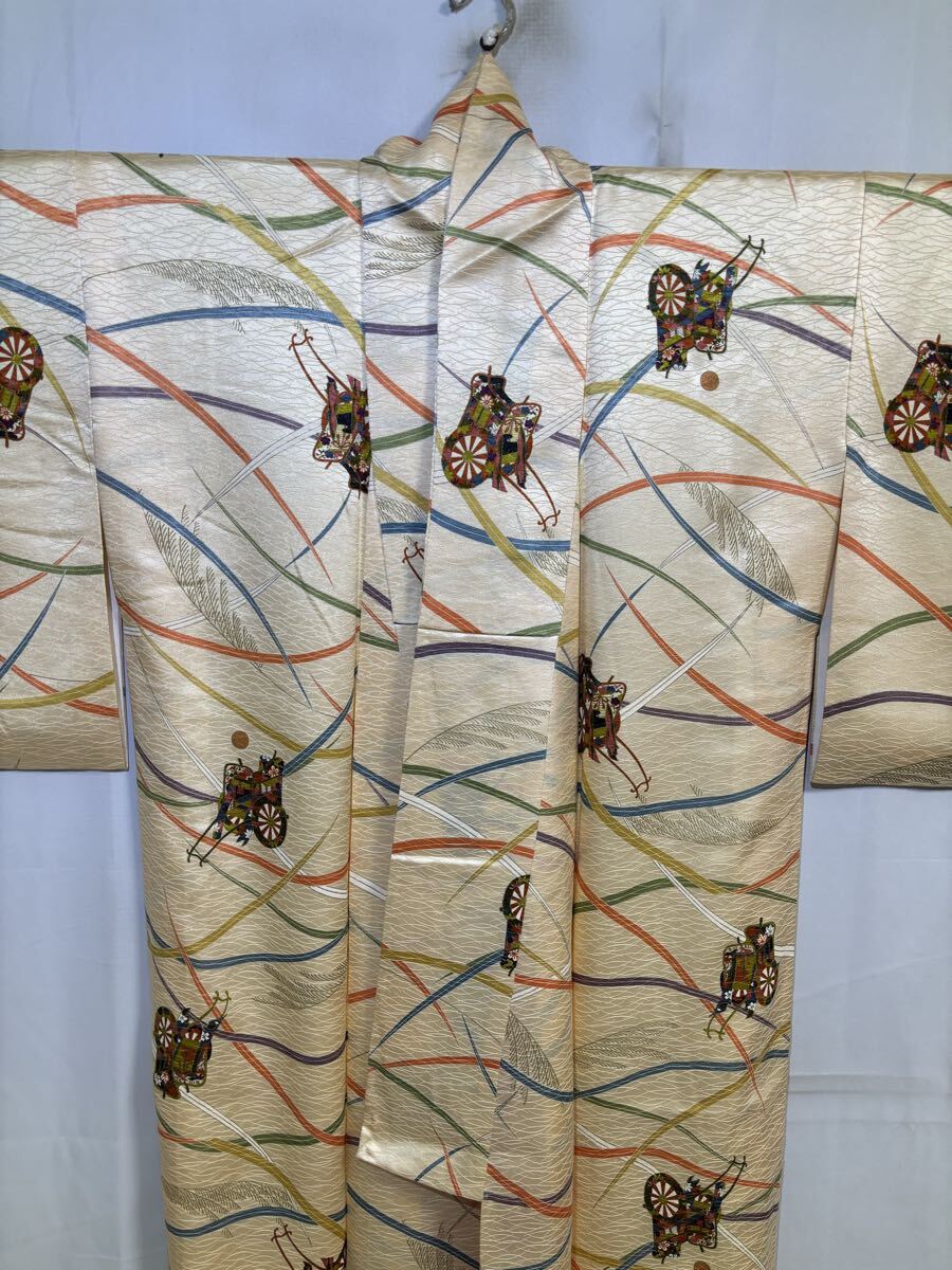 This premium vintage kimono features an elegant ivory-gold base adorned with flowing multicolored lines and refined Goshoguruma (imperial carriage) motifs, symbols of prosperity, noble journeys, and auspicious beginnings.