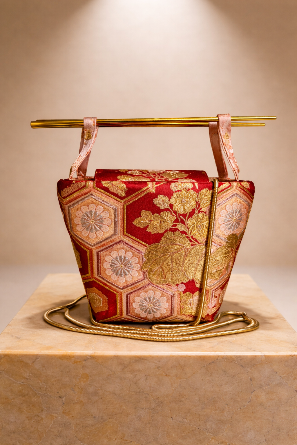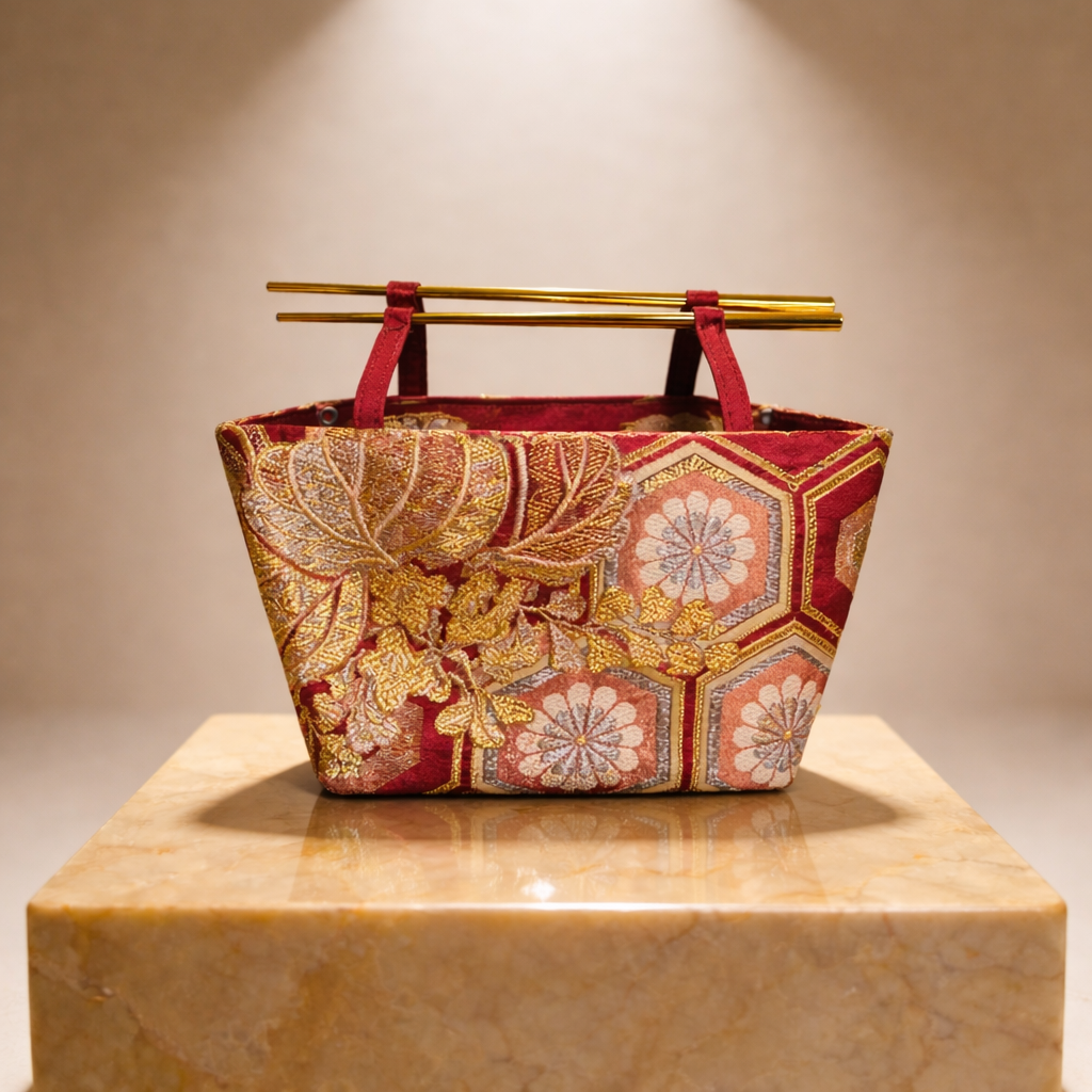 The Chopstick Bag is crafted from vintage Japanese obi silk, reimagined into a modern silhouette. Structured handles inspired by chopsticks create its distinctive architectural form — delicate yet bold.