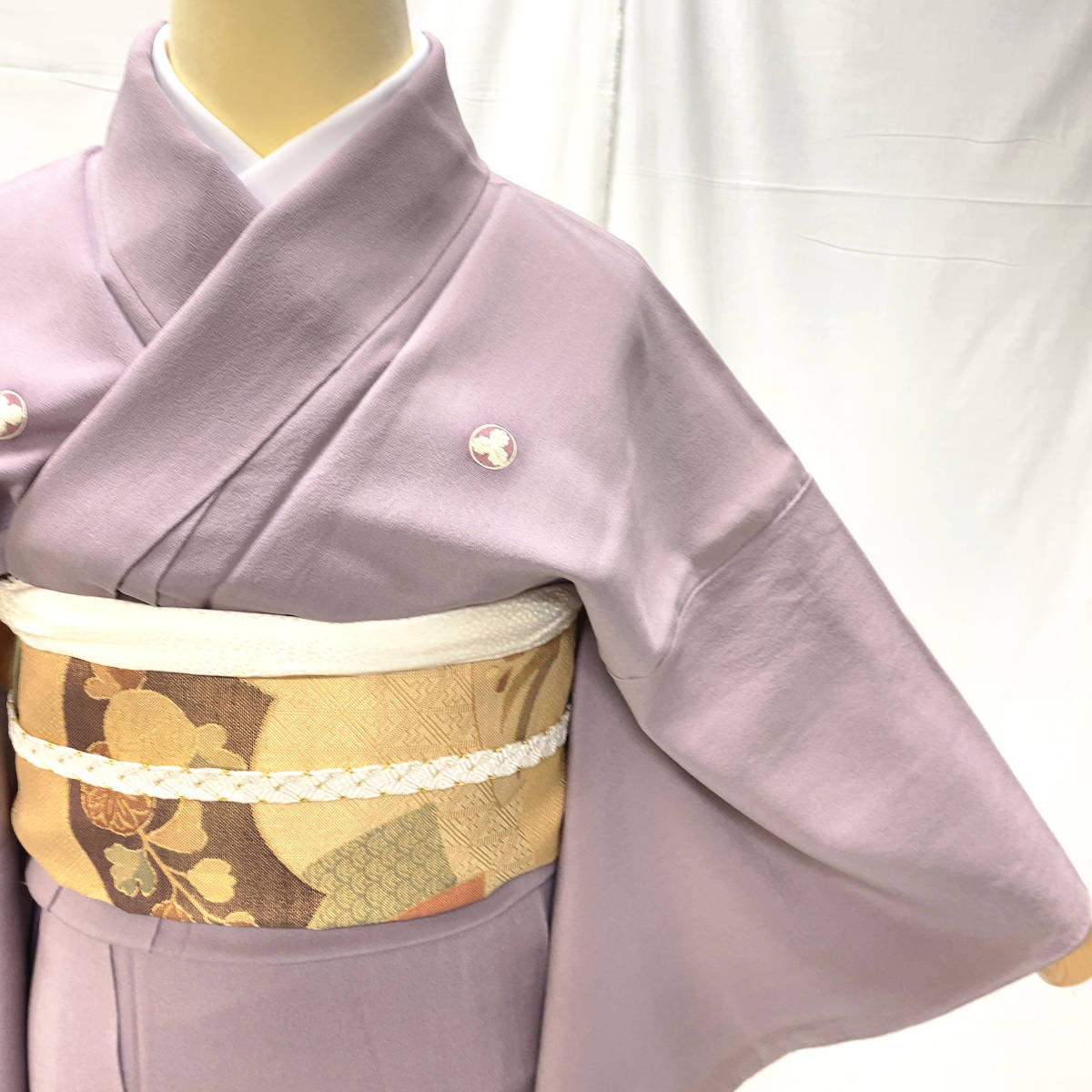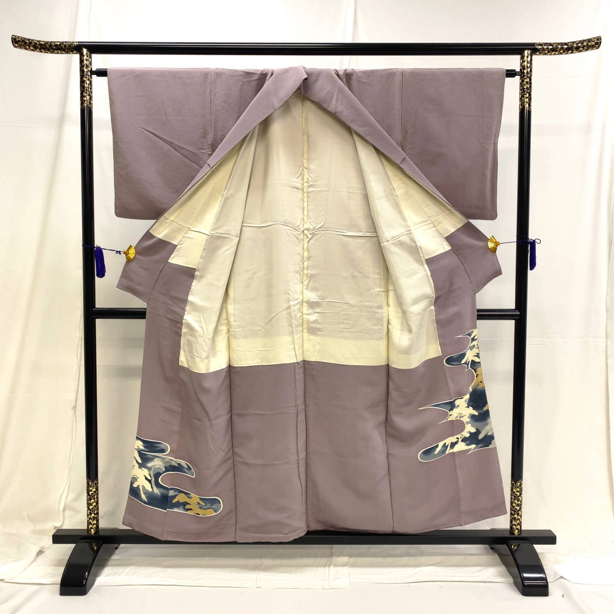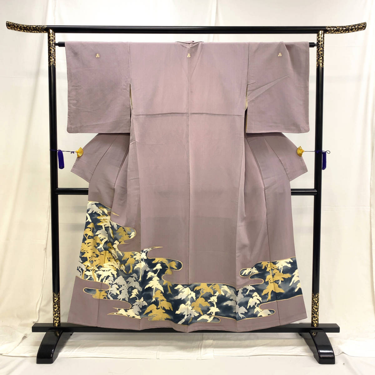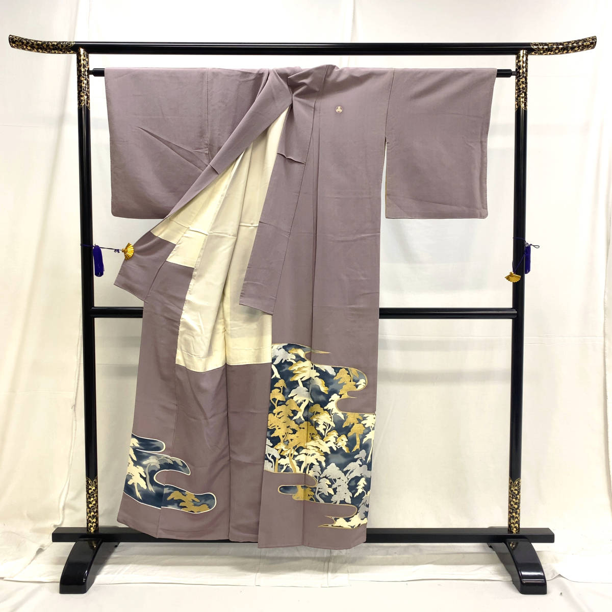Notably, the kimono bears family crests (mon) on the upper body, indicating its formal status. The presence of multiple crests elevates the garment’s level of formality, placing it just below the black tomesode in traditional ranking.