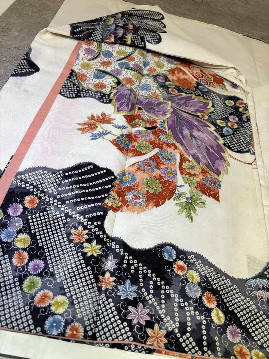 A dramatic, flowing pattern inspired by traditional shibori techniques cuts across a soft ivory ground, creating a powerful sense of rhythm and direction. Scattered throughout, richly colored floral motifs emerge—layered, intricate, and alive with contrast.