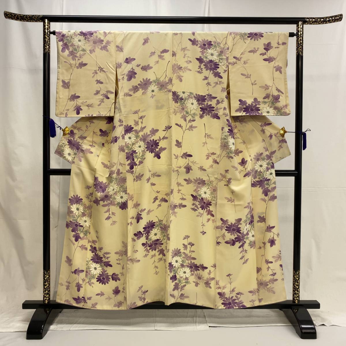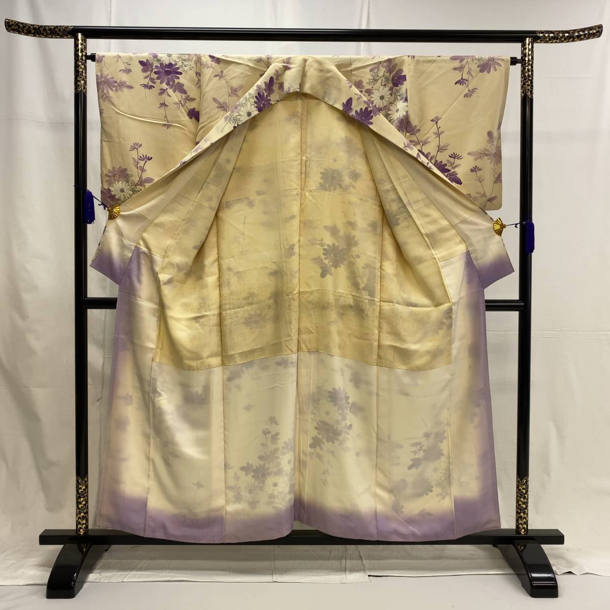 This kimono features a gentle ivory base layered with flowing floral motifs in soft shades of violet and lavender.